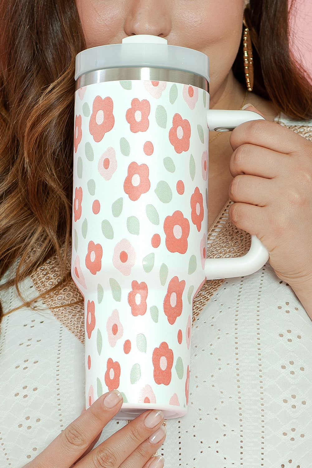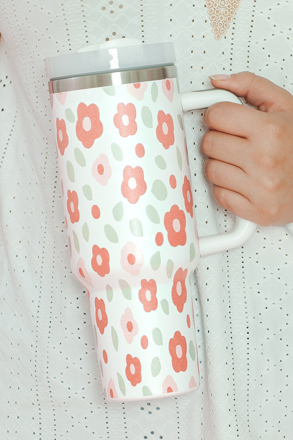 Großer tragbarer Edelstahlbecher mit Blumen- und Blätterdruck, 40 oz