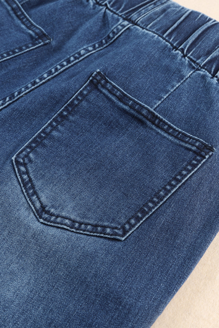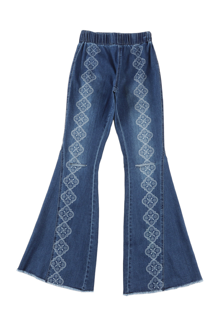Introducing our Blue Laser Burn Distressed Raw Hem Bell Bottom Jeans. These women's graphic jeans feature a unique laser print design that adds a touch of edginess to your look. Made from high-quality denim, these jeans are not only stylish but also durable. Elevate your style game with these one-of-a-kind bell bottom jeans.